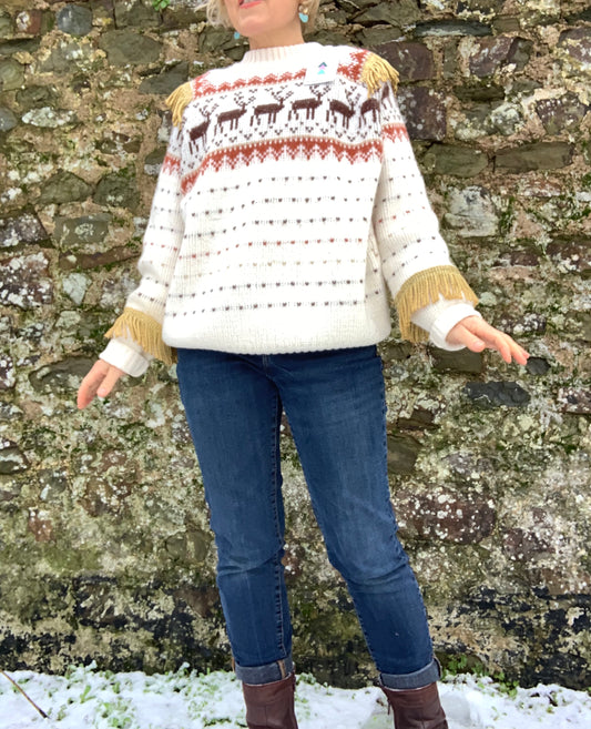 Vintage 1980s, chunky jumper with deer pattern and tassels! One size