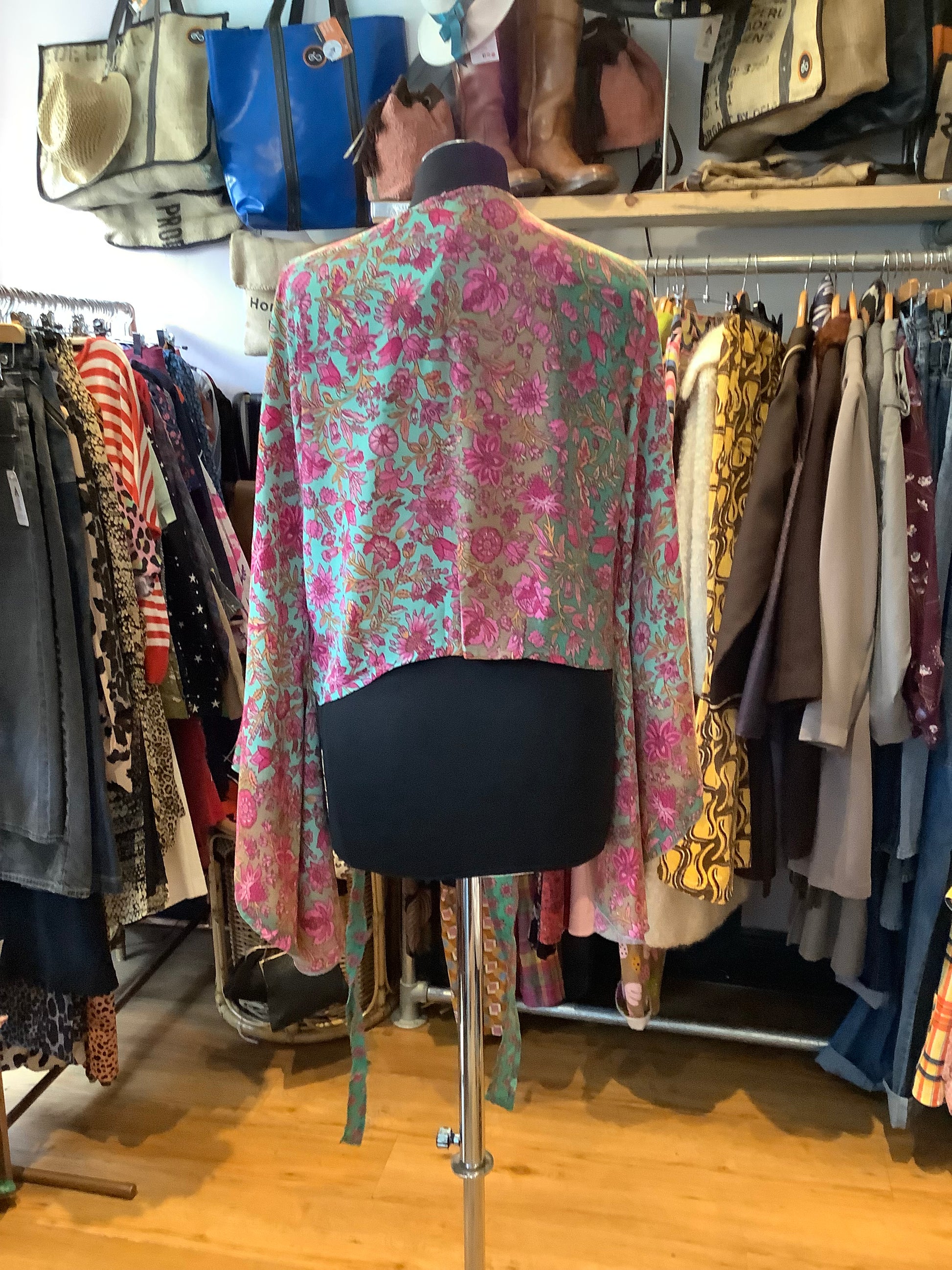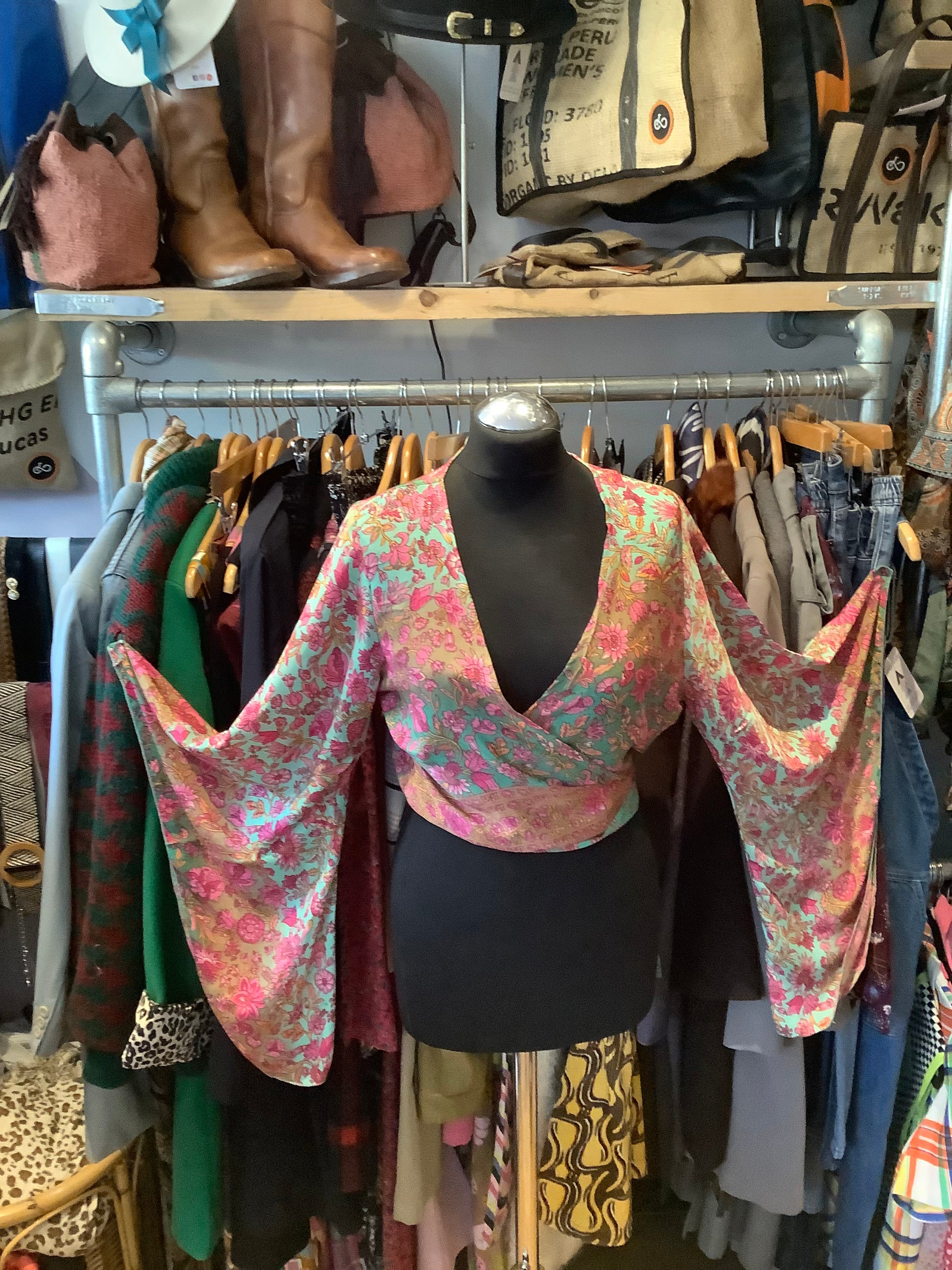 Handmade colourful Indian sari fabric bell sleeve wrap top