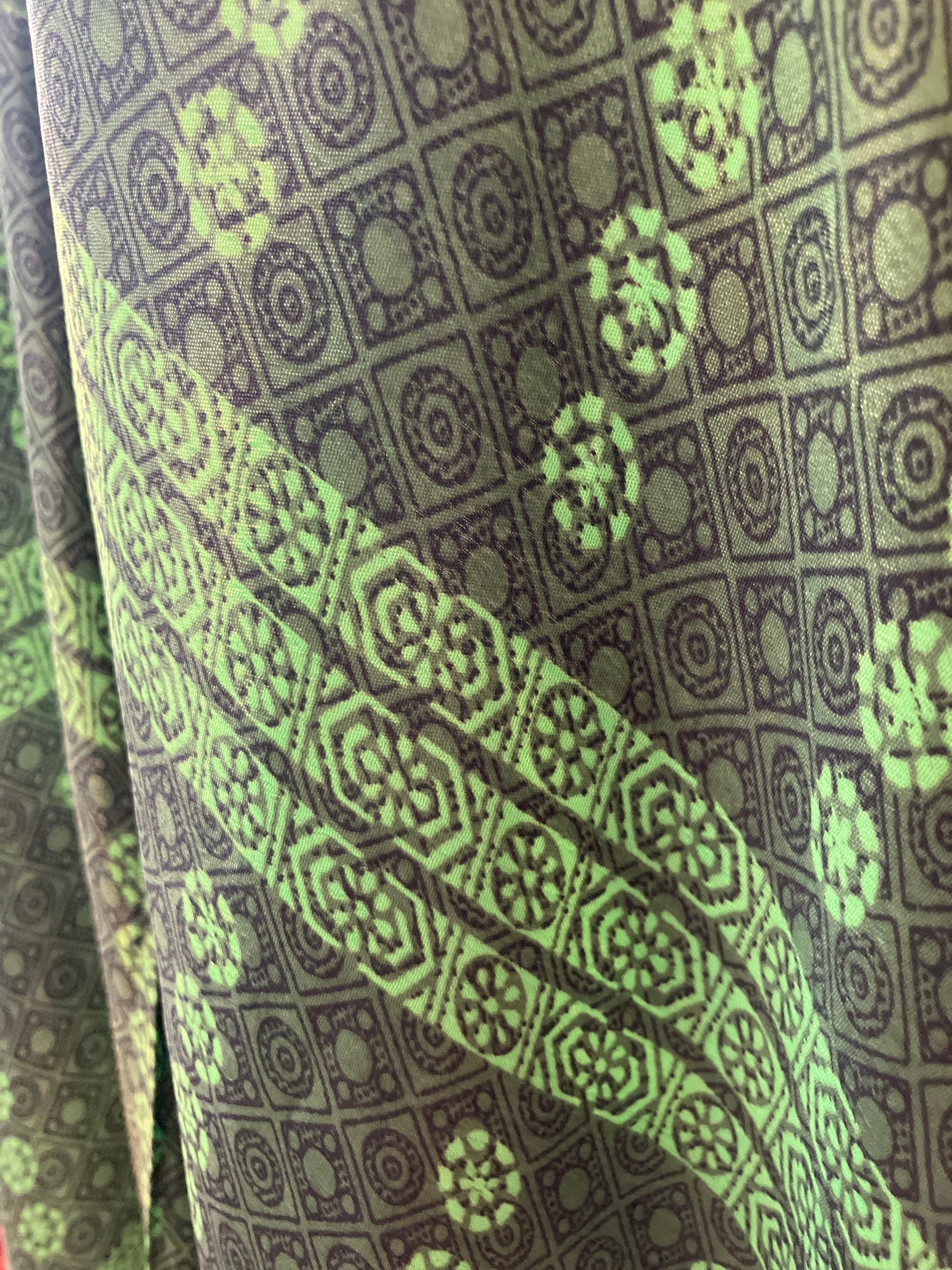 This particular one is a vibrant shade of green with a black ethnic style pattern running throughout the romper, the fabric had a very slight sheen almost luminescent when the light shines on it.