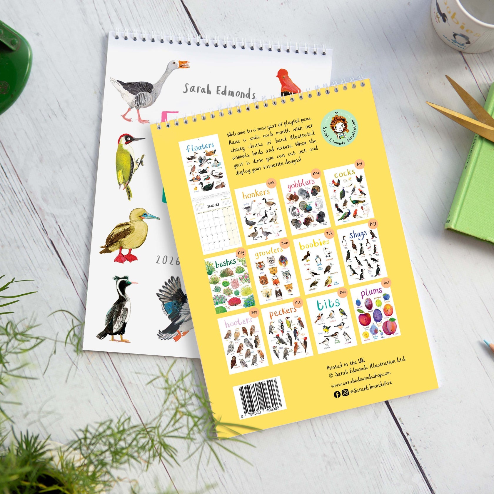 This double page pun calendar includes a selection of best loved animal, bird and nature designs. The crisp, colourful illustrations have been created with a fusion of paints, crayons and digital media. They are accompanied by Sarah’s signature hand drawn typography for the species names and humorous, eye-catching titles.