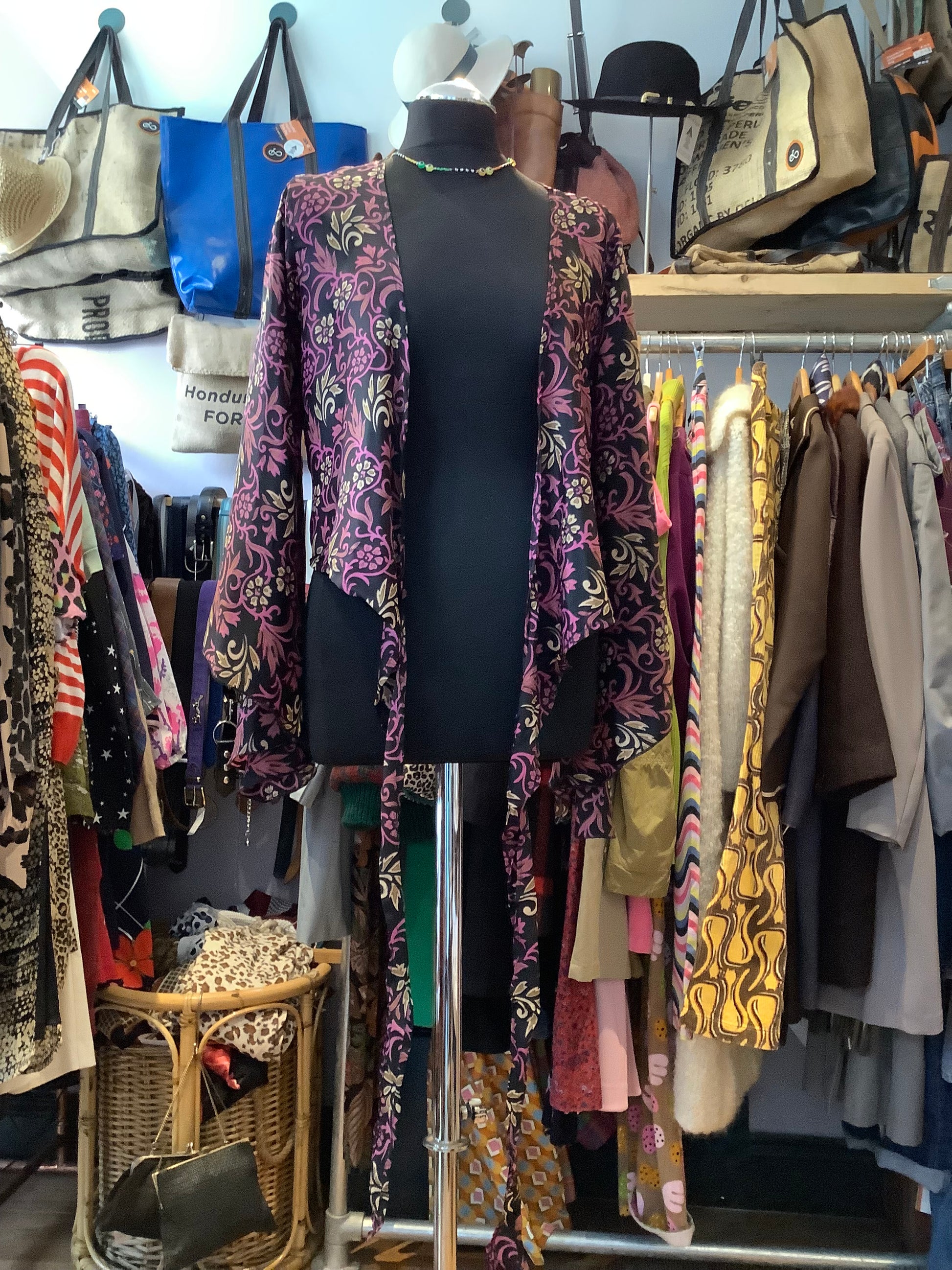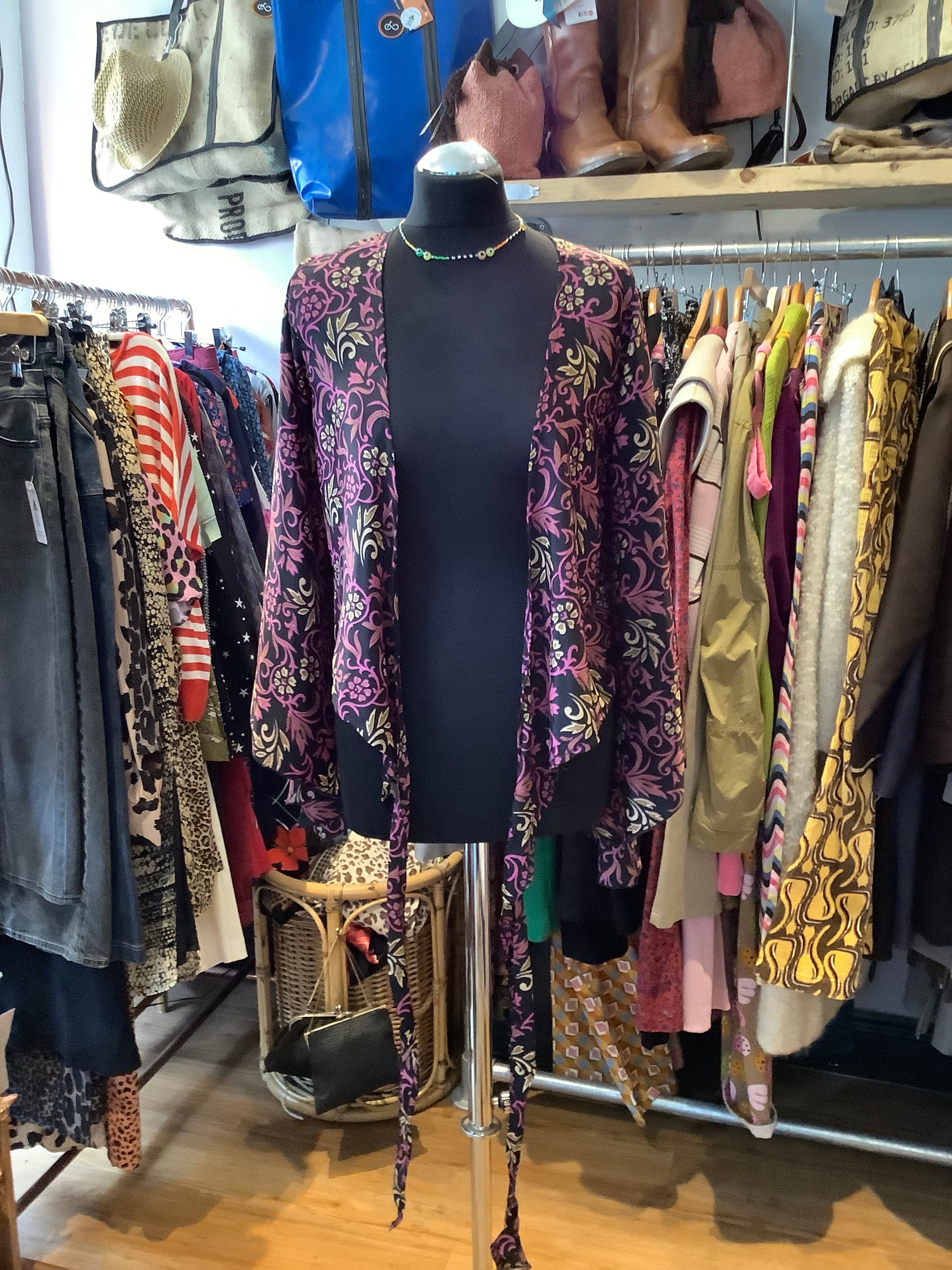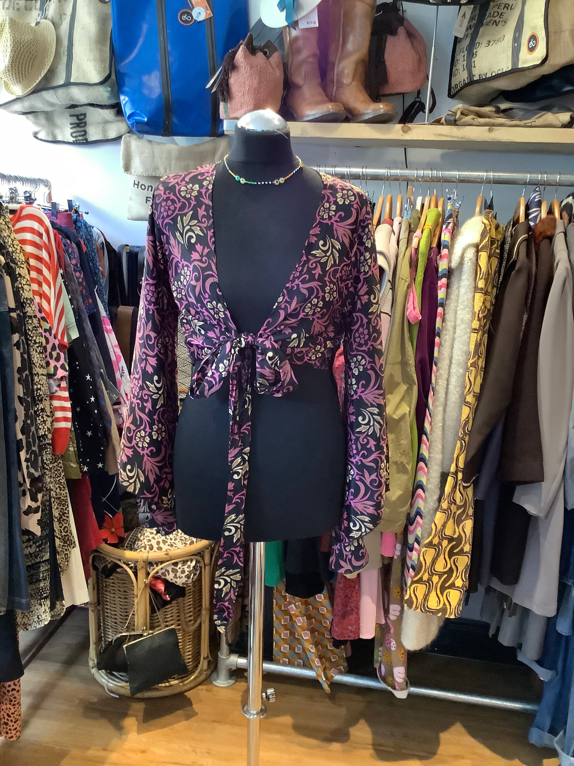This stylish wrap top is crafted from recycled Indian sari fabric, Its lightweight, sustainable material is comfortable while still looking stylish. Its versatility gives you the freedom to create multiple looks whether you wear it open over another layer as a shrug, wrapped with ties at the back or just as a front tie belly top over a vest, dress or even a skinny polo in the cooler months it will be a chic addition to your wardrobe.